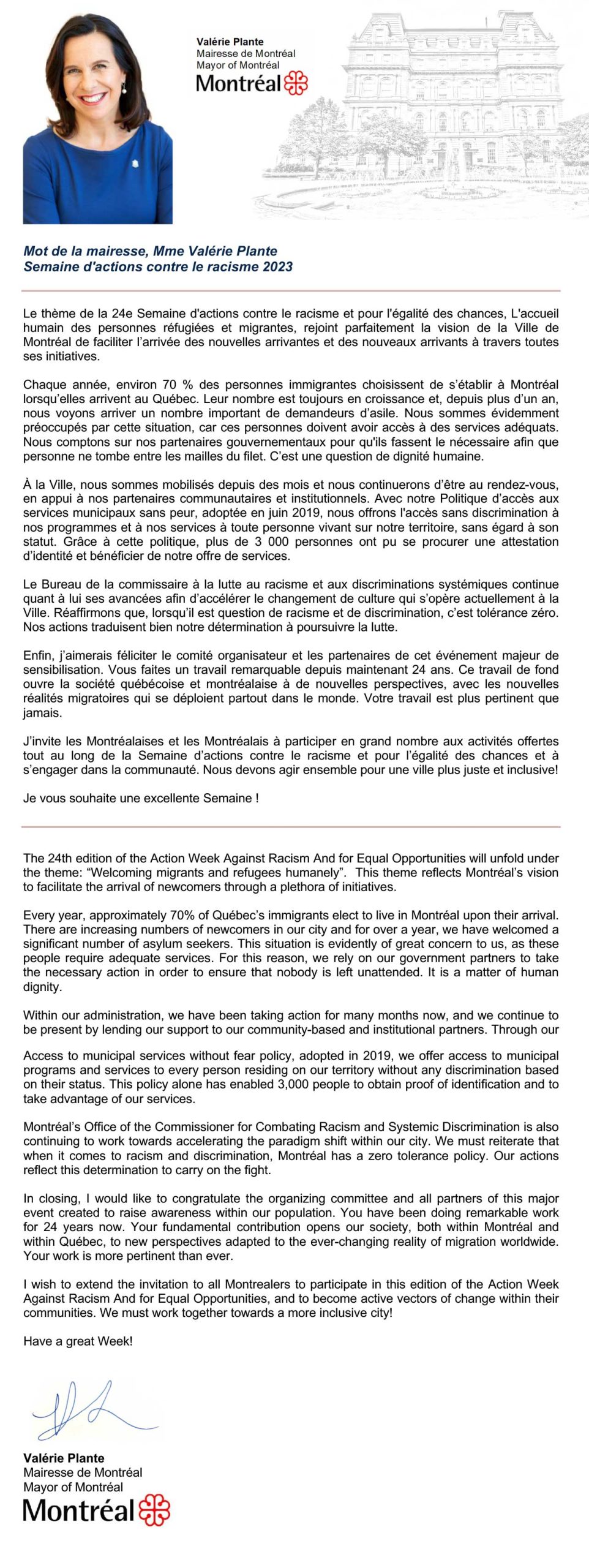 • MESSAGE DE MME VALÉRIE PLANTE, MAIRESSE DE MONTRÉAL •