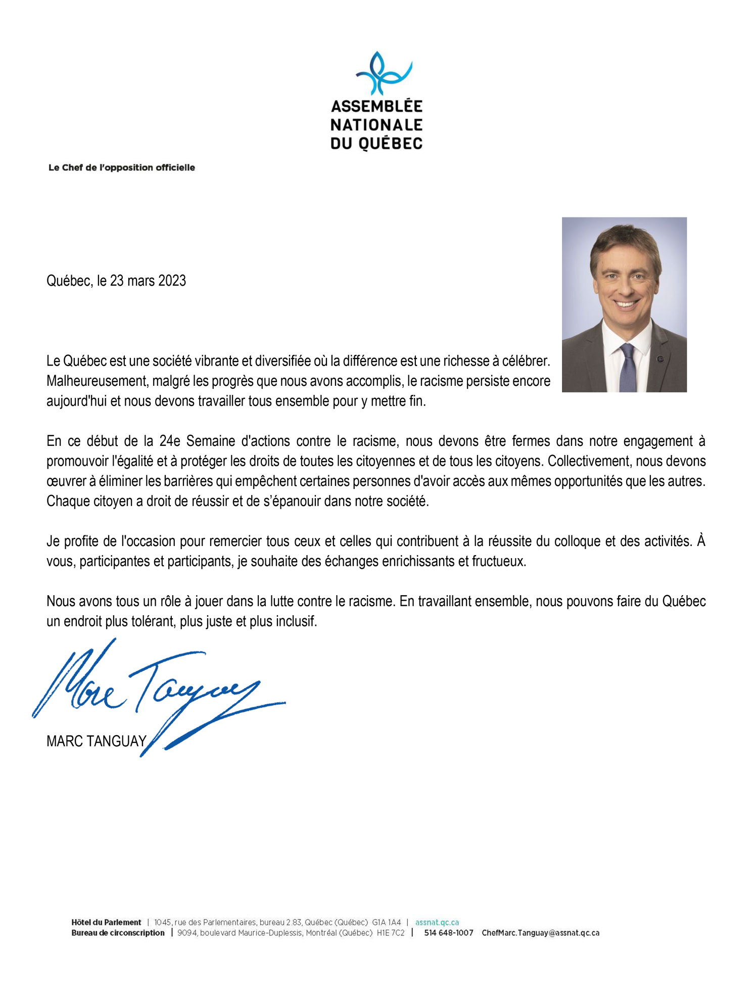 MESSAGE DE M. MARC TANGUAY, Député de l’Assemblée nationale du Québec